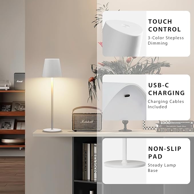 - 3 Color Temperatures Touch Lamp: The white cordless desk lamps are available to turn ON/OFF and switch the 3-color lighting modes by touching the button on the top of LED wireless lamp. Tap to change 3 color temperatures of lighting: 3000K warm white, 4000K natural white, 5000K daylight white. And long press the touch button to adjust the stepless brightness for each color lighting from 10% to 100% (With lighting memory function)