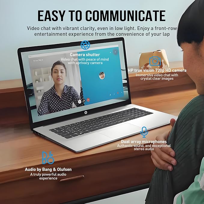 - Precision in Every Detail: This HP 17 laptop i3 has a brushed finish full-size numeric keyboard and lift-hinge for comfort typing. Enjoy crisp video on the 720p HD camera (with privacy shutter) and clear sound from B&O dual speakers noise-reducing mics on this 17 laptop hp. Perfect for calls, work, and play. Access your AI-powered assistant fast with the Copilot key