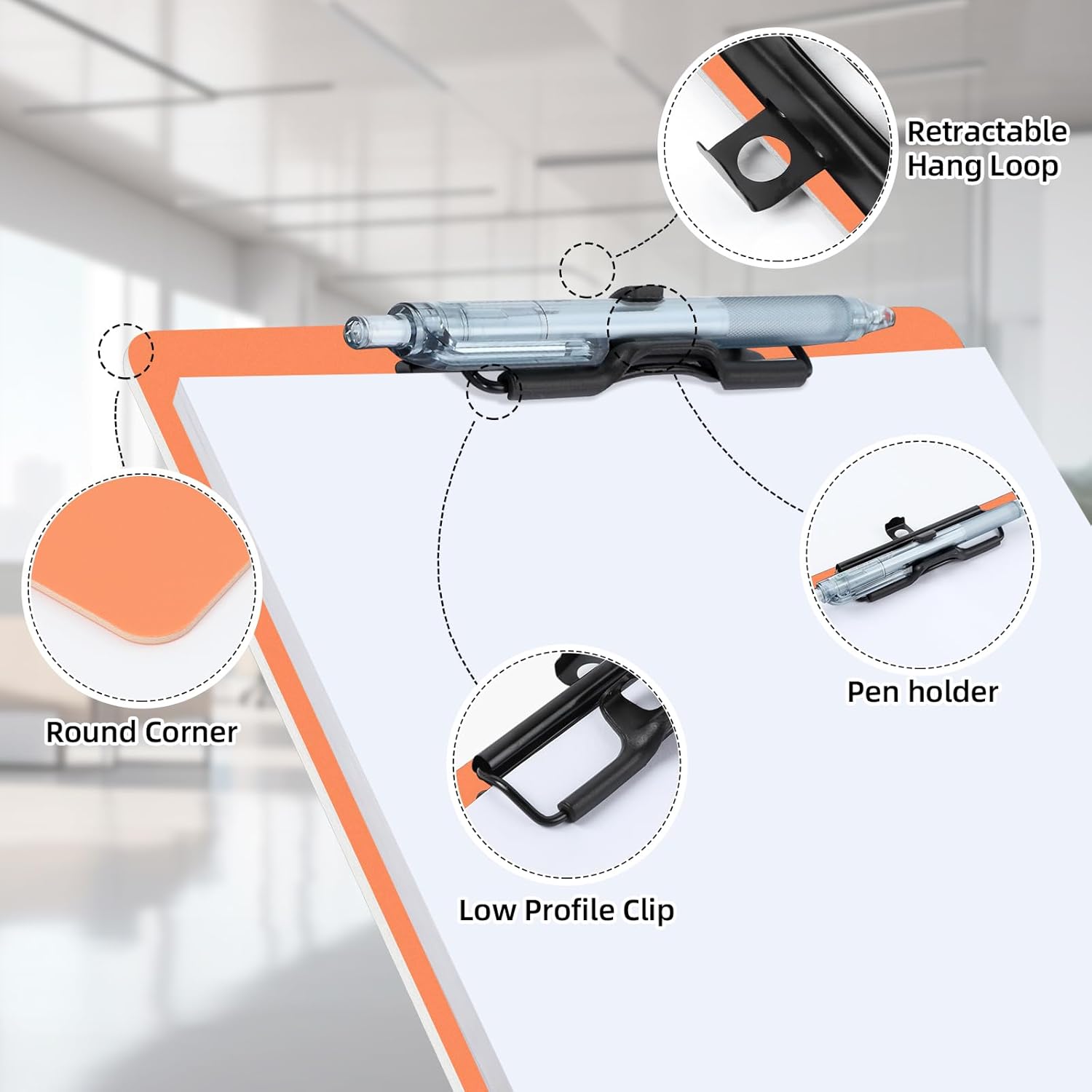 Clipboard with Pen Holder, Plastic Clipboard with Low Profile Metal Clip, Hanging Clipboards Holds 8.5x11 Inch Papers, Standard A4 Letter Size Clip Board for Office & School, Orange