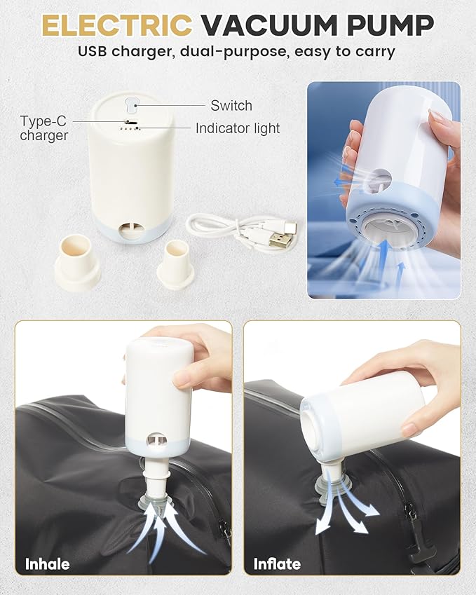- 💎 Portable Vacuum Pump - Comes with a compact vacuum pump for on-the-go convenience. Multiple nozzle attachments allow precise air extraction, whether you're quickly compressing clothes or adjusting storage space.