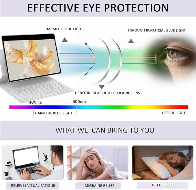 - REDUCE HARMFUL BLUE LIGHT - If you use your mobile phone/computer/TV/Read for a long time, you will feel Poor sleep/Dry eyes/Eye congestion/Blurred vision/Photophobia, Blue light is hurting you, you need a pair of Henotin anti-blue light glasses to protect your eyes from these troubles.