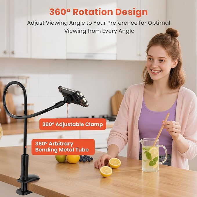 - 360° Rotatable & Flexible Mechanical Arm: This gooseneck phone stand rotates freely and bends to any angle, letting you easily find the perfect position for reading, watching videos, or video calls. Enjoy stable, hands-free comfort in bed, at your desk, or anywhere you need it.