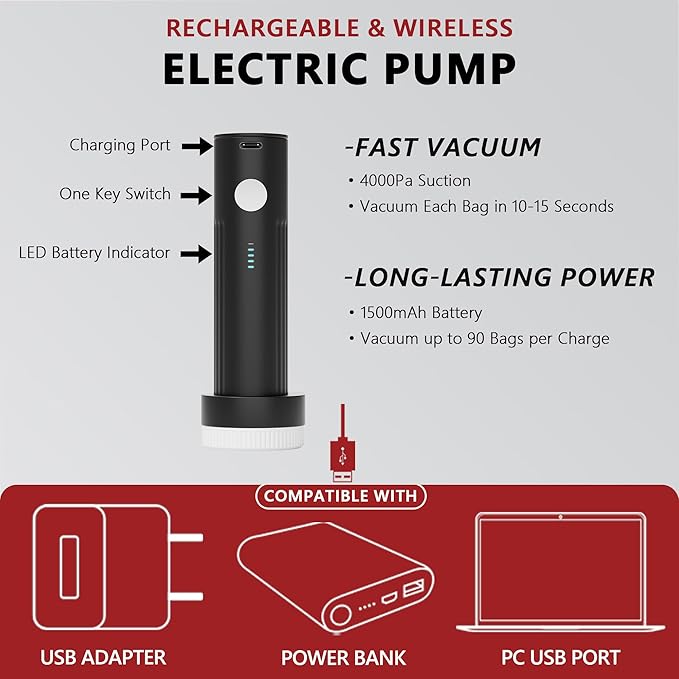 - Rechargeable & Wireless Electric Pump: Effortlessly enhance your packing and storage efficiency with our state-of-the-art wireless electric pump. Powered by a 1500mAh battery, it allows up to 90 vacuum sealing per charge. With 4000Pa suction, it can compress a bag in 10-15 seconds.