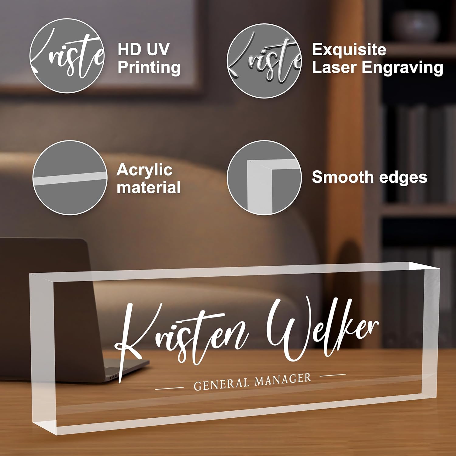 - 【Premium Acrylic Materials】:We use high-quality transparent environmentally friendly acrylic blocks to make custom name plates, and have two production processes, advanced HD printing technology with super strong adhesives, and fine laser engraving. The content of the name plate is clearly visible and will never fall off. The acrylic name plate is durable and can be used as a permanent desktop decoration.