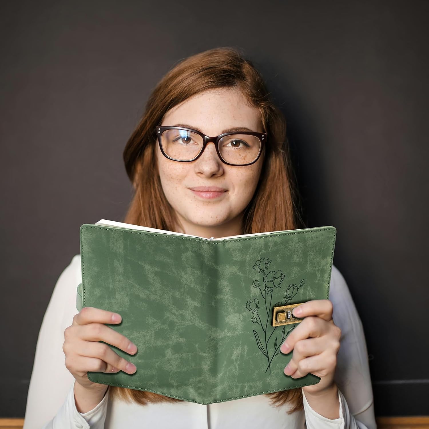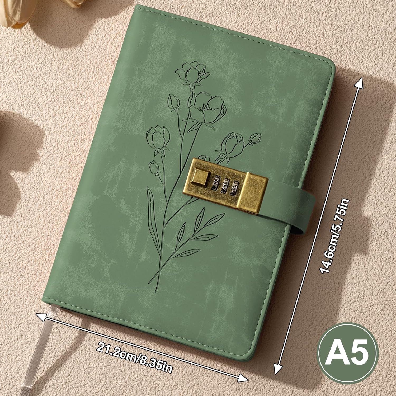 Lock Diary for Women Diary with Lock for Girls A5 Leather Locked Journal 260 Pages 100 GSM Refillable Journal with Lock for Teens Secrets Flower Journals with Combination Passwords, 5.7"x8.3", Green