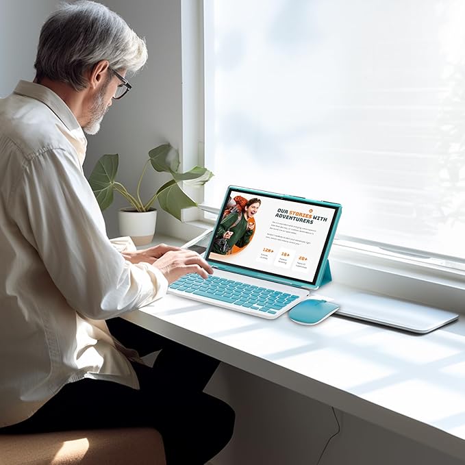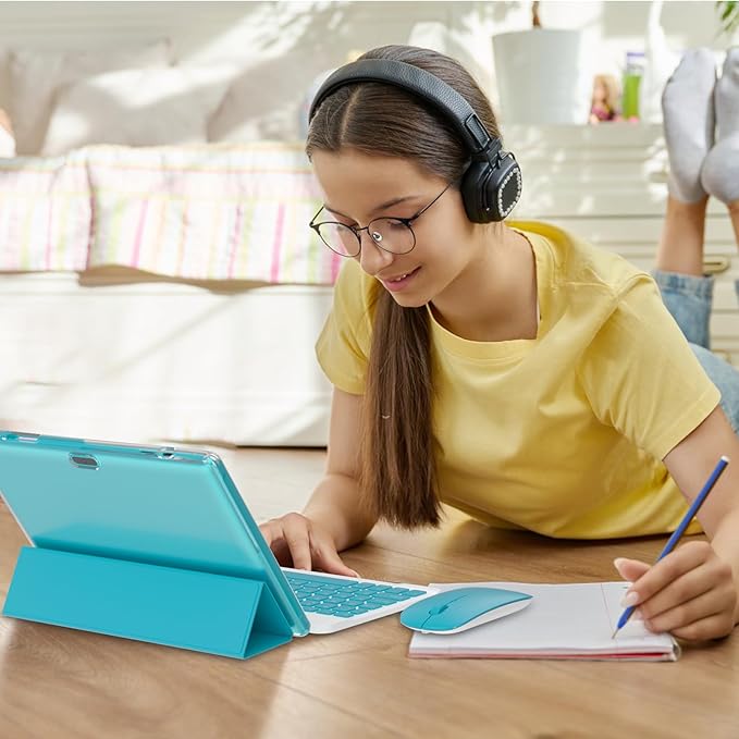 - 【Portable 2 in 1 Tablet with Keyboard】 This 10.1 inch android tablet equipped with a bluetooth keyboard, wireless mouse, and stylus as well as a foldable protective case, allowing you to seamlessly transform your 10'' tablet into a laptop-style device. This versatility makes it the ideal device for those who need to be productive on the go, whether it be for work, study, or play.