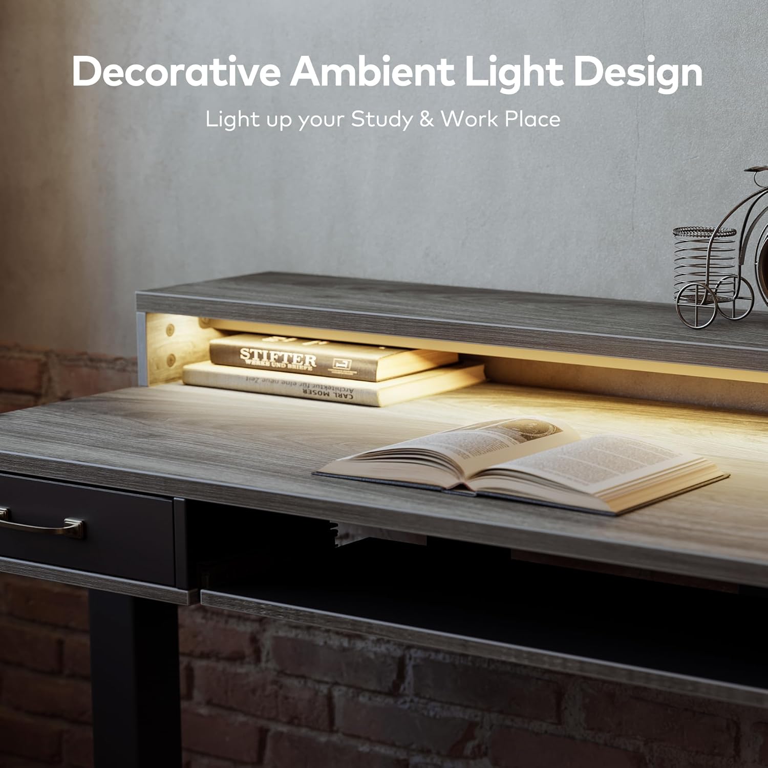 FEZIBO 55 x 24 Inch Height Adjustable Electric Standing Desk with Double Drawers&Keyboard Tray, Stand Up Desk with LED Strips&Monitor Stand,Rustic Grey Top