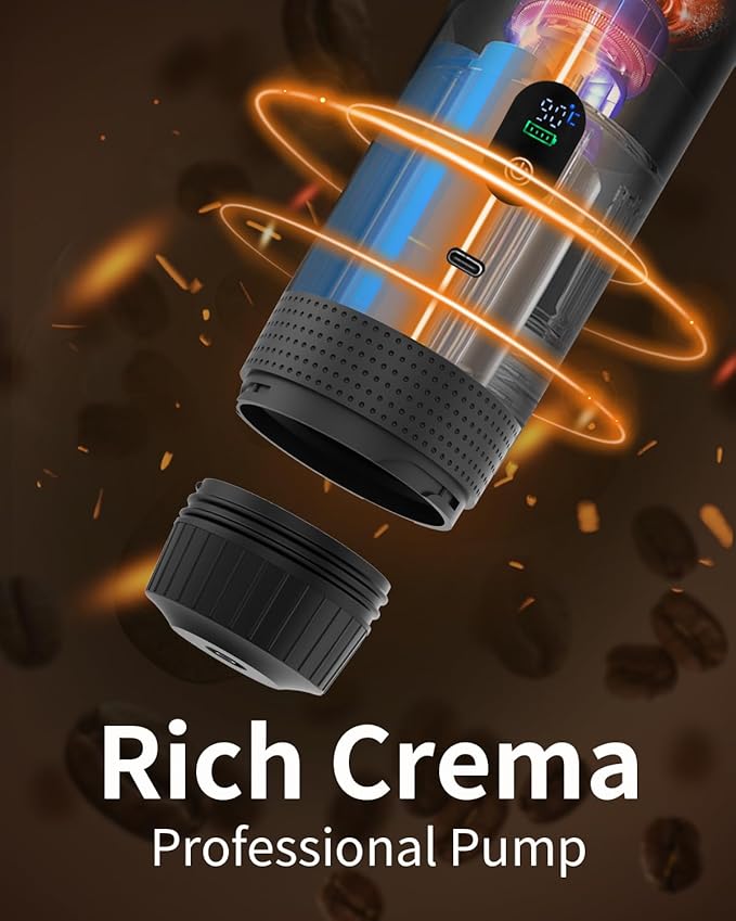 - Fast Self-Heating & Rich Crema: In just 3-5 minutes, the self-heating system heats 2.7oz of water from 76°F to 187°F, while the 20-bar pressure ensures smooth espresso extraction with a rich, velvety crema. Get professional-quality results in no time! 20 Bar Mini Small 5V Car Coffee Maker for Travel Camping