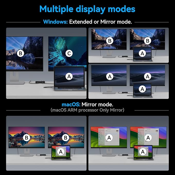 - Extended Mode and Mirror Mode:The USB C video hub supports image transmission in both extended mode and mirror mode. Extended mode: The laptop must support MST mode to use extended mode for image transmission (ABC separate displays). Mirror mode: The laptop must support SST mode to transmit images normally (AAA, ABB). Note: Windows systems support MST mode, allowing you to freely use either extended or mirrored mode. Mac systems only support SST mode, so only mirrored mode is available, and both displays will show the same image