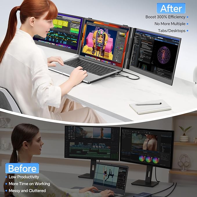 - 【Multiple Modes】Improve your workflow by up to 300% with the travel monitor for laptop, which features extended, mirrored, portrait, and duplicate display modes. Easily multitask across three screens—manage spreadsheets, attend virtual meetings, edit media, or stream content—without constantly switching windows. Perfect for programmers, traders, designers, content creators, and busy professionals