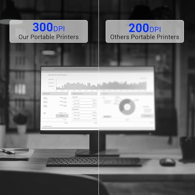 - Inkless Printing at 300dpi Resolution: This mobile printer uses advanced thermal technology, no ink, toner or ribbon is required during printing, no clogging and cleaning problems! Just use thermal paper, no need to use ordinary copy paper. The printer delivers crisp prints at a resolution of 300 DPI, ensuring your documents appear clean and professionally produced