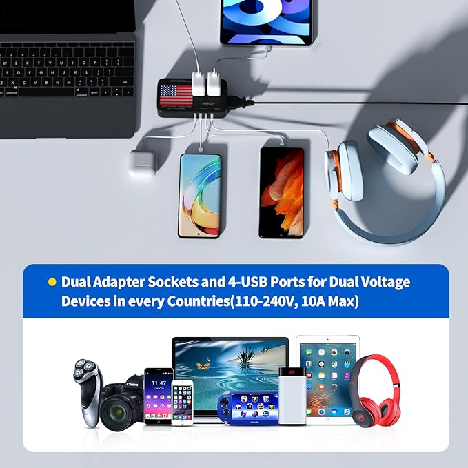 - ✈✈✈【Universal Travel Adapters I, II Sockets】- - 10A Dual Adapter Mode CAN NOT convert voltage, support input/ output (100V-250V AC, max 10A),and EU/UK/AU plugs is suitable for all DUAL VOLTAGE devices(100-240V) up to 10A.Such as CPAP machine, electric toothbrush, fan, Kindle, TV, DVD players,iphone, macbook, dual voltage hair straightener /flat Iron/curling Iron/hair dryer etc.