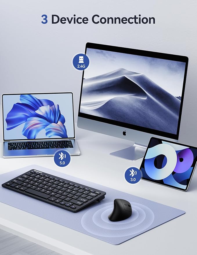 - Three-device connectivity: This vertical mouse features 2.4G wireless and dual Bluetooth (BT5.0 and BT3.0) technology, allowing simultaneous connection to three devices. Easily switch between your computer, laptop, and tablet with a simple press of the bottom button, boosting your productivity