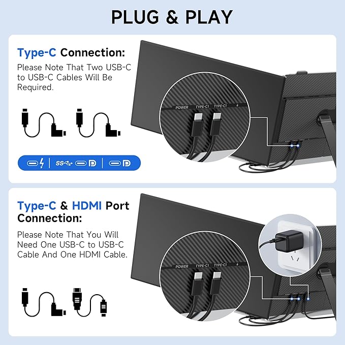 - [Convenient Connection]- No need to connect both screens separately anymore,two screens now can be connected at the base of the triple laptop screen extender. This triple portable monitor has upgraded the connection port to make both "Type C 1/2 ports" support full featured type C connection and HDMI connection.Just make sure your laptop has 2 full-featured Type C ports or 1 full featured type C port + 1 HDMI port then you can make it work perfectly. (Notes: if the screens shows no power,please use the USB A-C power cable and one adapter through the "PD" port to power the screen.)