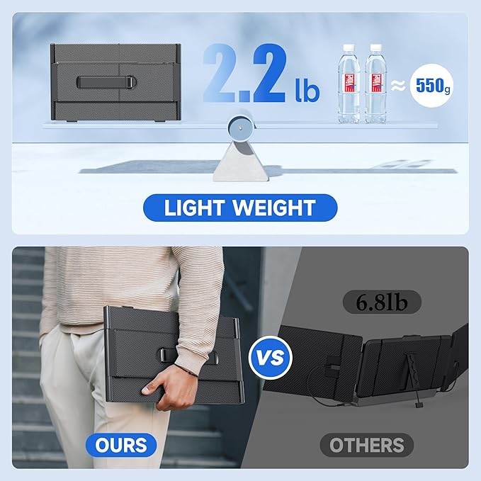 - [Ultra thin & Lightweight]The upgraded ultra-slim laptop screen extender is just 4.5mm thick—thinner than most smartphones—and built for true portability. Weighing only about 1.3 lbs, just slightly heavier than a bottle of water, this triple portable monitor fits effortlessly into your bag without adding bulk, making travel a breeze. Whether you're a frequent traveler, digital nomad, or remote worker, this lightweight screen extender is the perfect productivity companion on the go. The triple monitor is also a thoughtful and practical gift for anyone who needs to work efficiently.