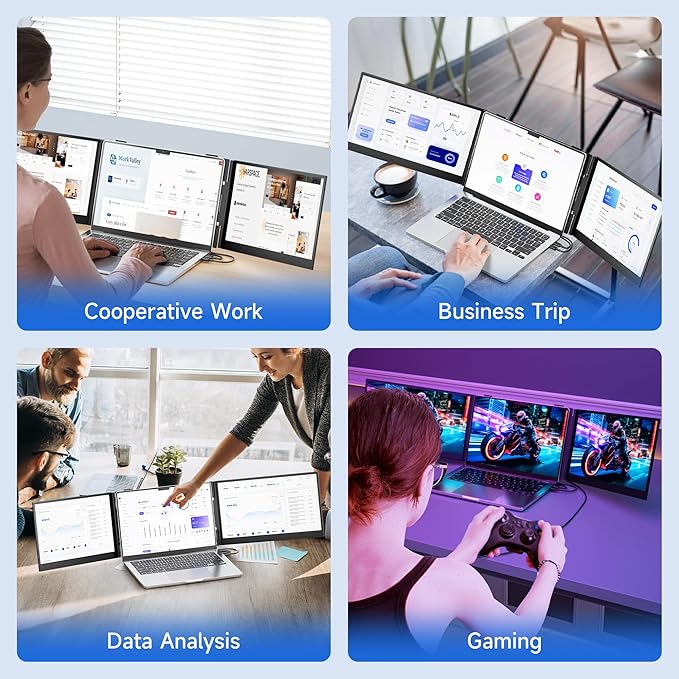 - [Triple screen, Triple efficiency] The portable monitor is the perfect triple screen monitor for laptop, allowing you to open multiple windows simultaneously without switching back and forth continuously on a single laptop screen, improving your efficiency by up to 300%. With this monitor extender for laptop, you can easily build your own working station anywhere. Very suitable for conference presentations and multitasking. Perfect for gamers, programmers, finance and investment professionals, designers, and anyone who needs more efficient workflows.