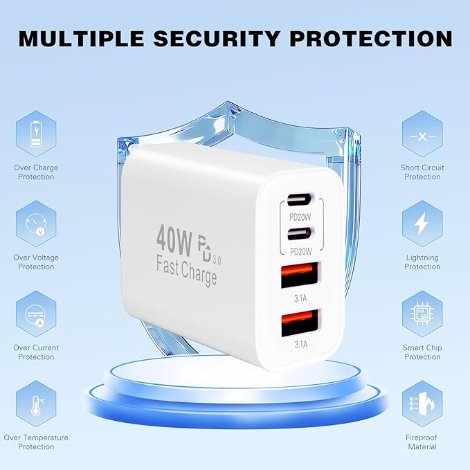 - 【Safety & Reliability Multiport Charger Fast Charging】Multiport iPhone 17 16 15 Charger Adapter Certified RoHS,CE & FCC,Protect Devices from Over-Heated and Over-Currents,Over-Charging,and Short Circuits,Charging Will be Automatically Stopped When the Battery is Full.The 4 Port Charger Fast Charging Block Featured With ABS + PC Fireproof Material,You Can Make Sure Your Digital Devices are Always Safe Charge.