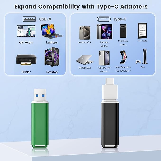 - 【Type-C Adapter Included】Each drive comes with a Type-C adapter, making it compatible with Type-C devices such as iPhone 15/16, Android smartphones, tablets, and PCs—switch seamlessly between devices