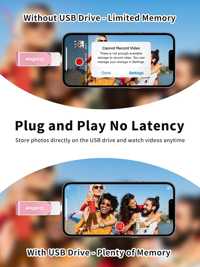 - 【Watch Movies, Photos and Play Music Directly From Phone Flash Drive】Store your favorite videos, audios and music on your iPhone's Photo Stick, then seamlessly plug and play on your iPhone or iPad anytime, anywhere. No more need for Internet or WiFi. This iPhone storage device plays videos in many different formats. Pictures stored on the Phone storage device also support different formats. Great way to store all your pictures and videos on an phone external storage device.