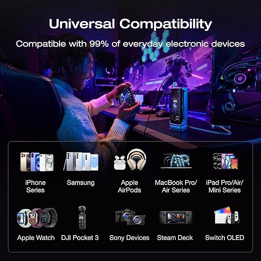 - High Capacity for Long-Lasting Power: With 27,650mAh capacity, this portable power bank can charge an iPhone 16 up to 4.5 times, a MacBook Air (49.9Wh) up to 1.3 times, or a Steam Deck (40Wh/50Wh) up to 1.4 times. At 99.54Wh, this battery bank meets TSA requirements (<100Wh) for hassle-free carry-on baggage, making it the perfect portable charger for travel.