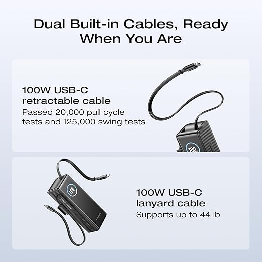 - 100W Built-in Lanyard and Retractable Cables: No more lost cables—the 100W built-in USB-C retractable and lanyard cables are there when needed and integrated neatly into the power bank's sleek design, with a retractable mechanism that lets you access power in seconds.