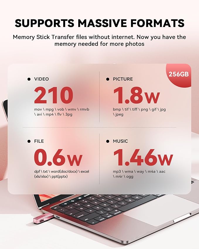 - Document and Photo Storage: This iphone photo storage stick provides a large storage capacity of 256GB and features Lightning/Type C/USB interfaces (with separate adapters) for convenient data transfer between different devices. No longer reliant on data cables, iTunes, or iCloud, you can securely store important files, photos, and other data. Never worry about running out of storage space on your iPhone again - you can easily store files on the USB drive and access and share them anytime.