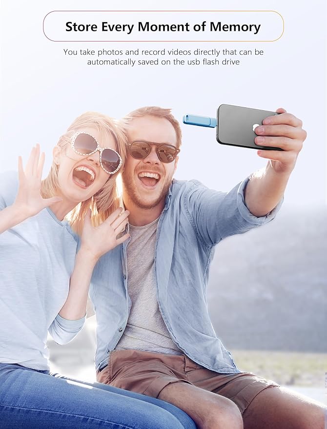 - One-click backup: Plug and play. With this MFI-certified iPhone usb flash drive, you can easily back up photos, videos, and phone book on your phone by One-Click from the APP, and you can also use the USB side to store your own backups on your computer for double insurance.(Tip: iPhone/iPad needs to download APP from APP Store when using jump drive; Android phone needs to turn on OTG function, no need to download APP)