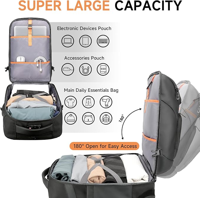 - 【 Aviation-approved 180° Carry-on Luggage 】This wheeled backpack features an airline-approved 180° opening design, making it effortless to pack, access, and organize clothes and office supplies efficiently. Enjoy a pleasant and safe trip with this well-organized luggage.