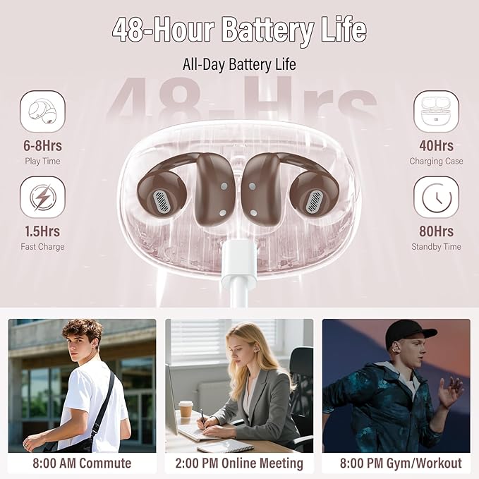 - 48-Hours Power Marathon & LED Power Tracker: Designed for long-lasting use, A101 clip-on headphones offer up to 8 hours of playtime per charge, extended to 48 hours with the charging case. The built-in LED display shows exact remaining power (0-100%)Built tough with 800+ charge cycles, these bluetooth earbuds are future-proof.