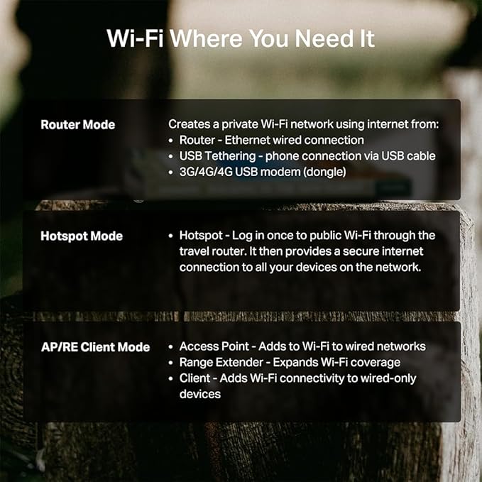 - ๐๐จ๐ง๐ง๐๐๐ญ ๐๐ง๐ฒ๐ฐ๐ก๐๐ซ๐, ๐๐ง๐ฒ ๐๐๐ฒ - Offers (1) Router Mode for Ethernet or USB (phone) tethering connections, (2) Hotspot Mode for secure access to public WiFi , and (3) AP/RE/Client Mode to extend WiFi, add WiFi to wired setups, or connect wired devices wirelessly.