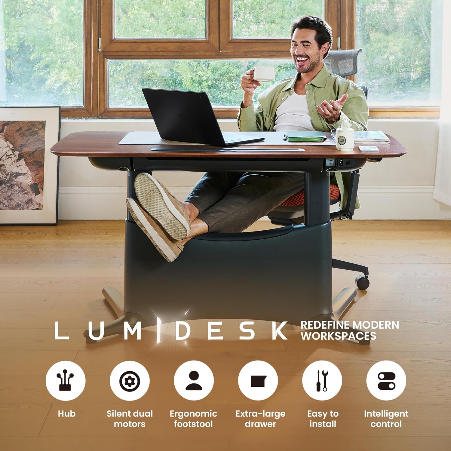 - ăPremium Whole-Piece Desktop & Sturdy FrameăCrafted with FSC-certified MFC and natural veneer, the one-piece desktop offers a seamless, elegant surface with stunning natural wood grain. Paired with a carbon steel frame weighing 119 lbs, it delivers rock-solid stability and long-lasting durability. Suitable for any use scenarioâthis adjustable desk can be used as an office desk, studio desk, study desk, gaming desk, computer desk and more!