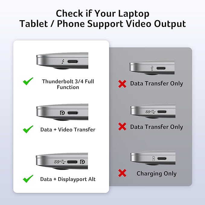 - ใFully Compatible with DP Alt ModeใThis dual hdmi adapter for 2 monitors supports Windows and macOS devices with DisplayPort Alternate Mode (DP Alt Mode), enabling display, charging, and data transfer. It is compatible with Acer, Dell, Lenovo, Surface, HP, ASUS, MacBook, Samsung laptops, smartphones, and accessories like mice and keyboards.