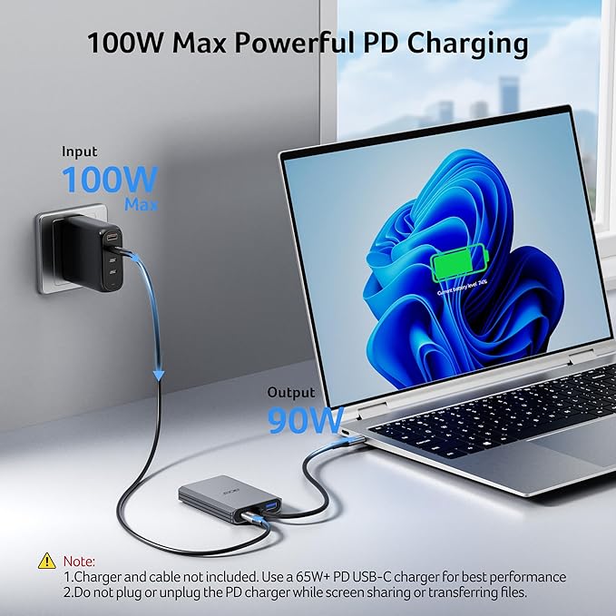 - ใReliable 100W PDใThis docking station dual monitor with 2 hdmi ports supports up to 100W input and safely delivers 90W to your laptop, keeping you powered while you work. ๐ Note: Ensure your laptop's USB-C port supports power delivery. Use a 65W or higher power adapter and cable (not included).