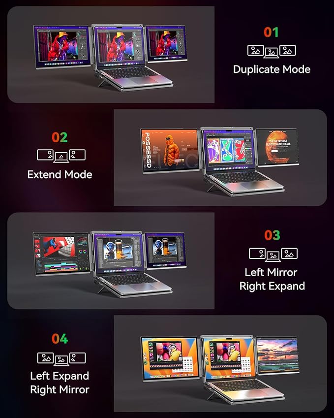 - BOOST PRODUCTIVITY WITH MULTIPLE MODES - Change between Mirror Mode for presentations or collaboration, and Extended Mode for multitasking across apps. A grayscale eye-care mode is also available at the touch of a button, cutting blue light even further. This external monitor for laptop is perfect for professionals, students, and digital creatives