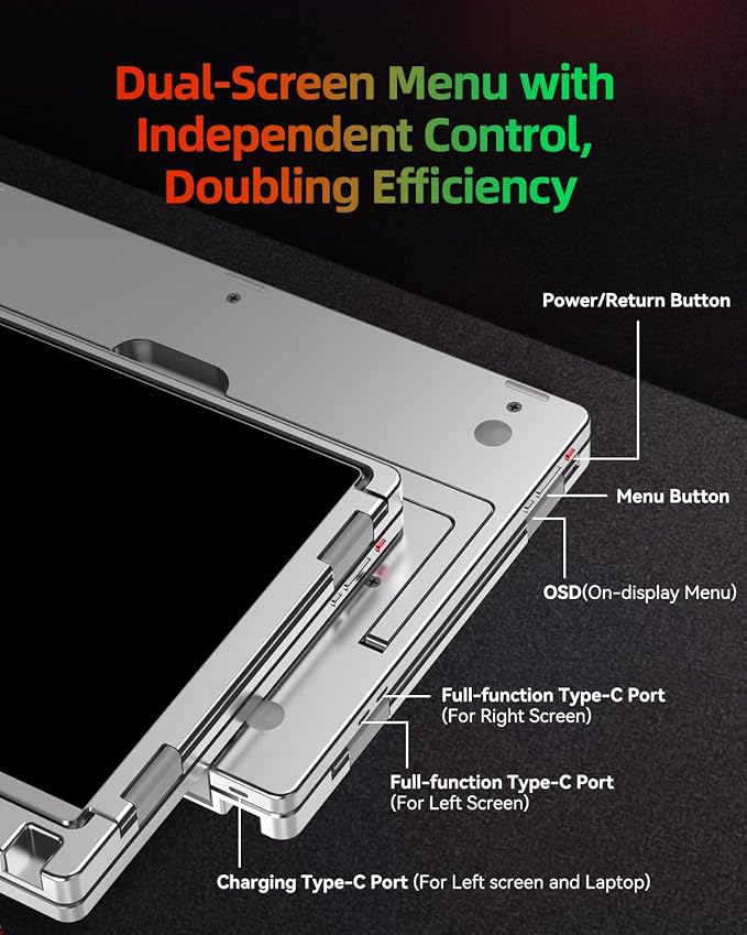 - DUAL-SCREEN PORTABLE MONITOR - Intehill LR13U portable monitor features 13.4 inch IGZO dual-screen display with exceptional color accuracy and brightness. Designed for professionals, this dual screen monitor for laptop delivers vivid, true-to-life visuals while maintaining excellent power efficiency—ideal for business, travel, or remote work