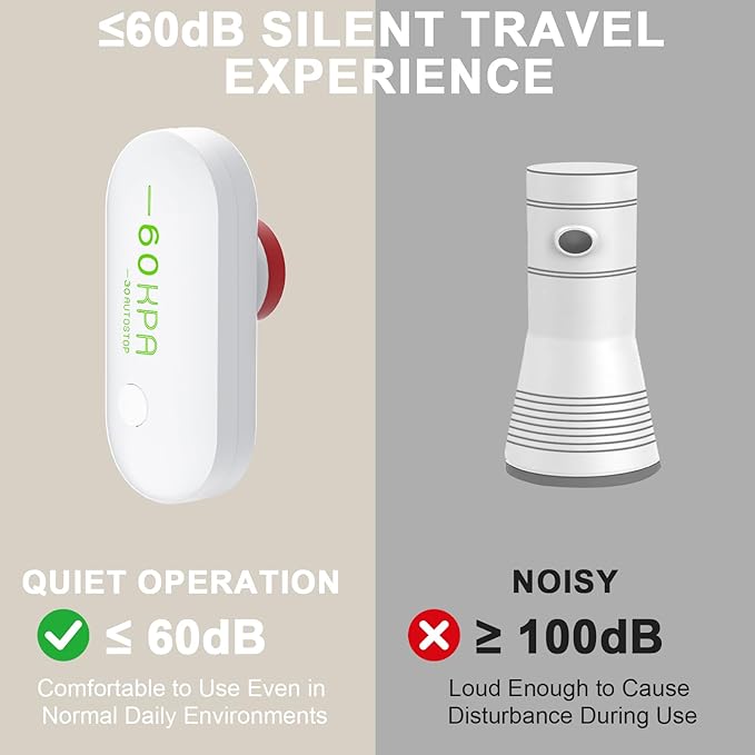 - ≤60dB Silent Travel Experience: Our travel vacuum electric pump operates at ≤60dB, far quieter than other products on the market with ≥100dB. The low noise ensures a stress-free packing experience anytime, anywhere, without disturbing your family. Enjoy efficient and silent compression with travel vacuum bags with pump, saying goodbye to noisy packing.