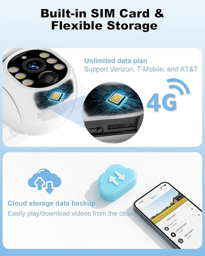 - Unlimited 4G Data & SD card / Cloud Storage: 32GB micro SD card for local storage of surveillance footage and important security events. The cameras supports TF card (up to 256GB, not included) and cloud storage. Please note: This camera does not support Wi-Fi connections.
