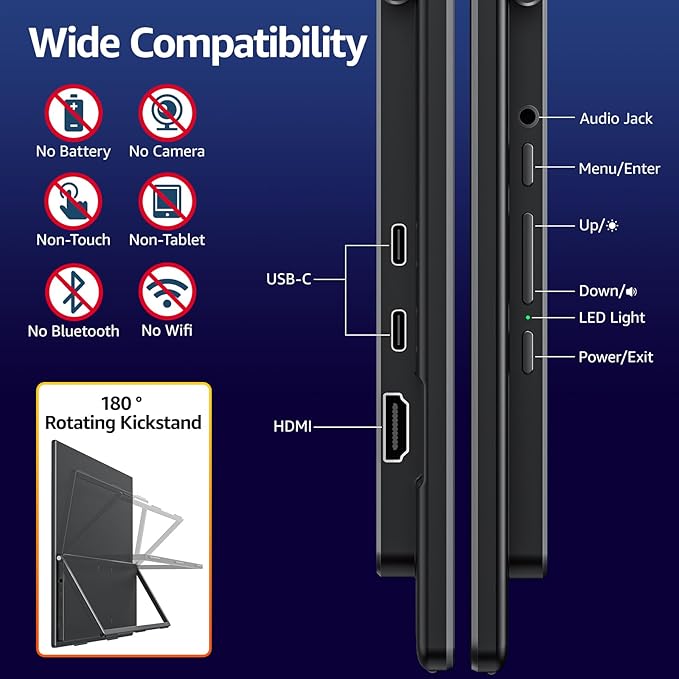 - Wide Compatibility & Effortless Connectivity: Equipped with dual USB-C ports and a standard HDMI port, this portable monitor is designed for universal compatibility with devices like MacBooks, Surface, PCs, Xbox, PS5, and more.