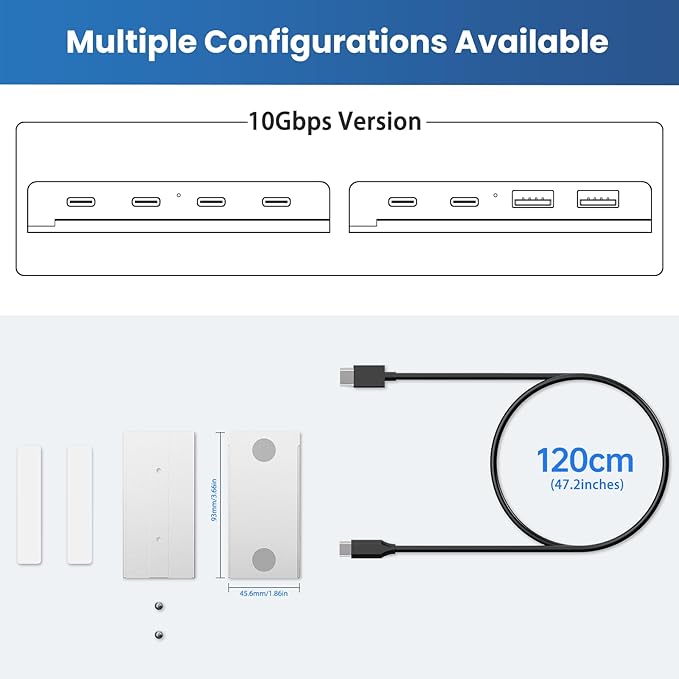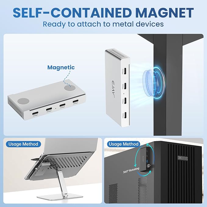 EJAY 10Gbps Magnetic USB-C Hub, 4-Port USB 3.2 Gen2 Data Transfer, Includes Sliding Rail, Screws and Sticky Pads for MacBook Laptop PC, Silver