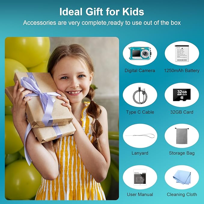 - 【Selfie Dual-Screen Design】This waterproof digital camera comes with front 2.8’’ and a rear 1.8’’ IPS screen, you can take pictures with all your partners in the same frame. It is also very light, portable, and easy to use. Perfect for kids at family gatherings, water parks, and vacations.The camera built-in 2s, 5s, 10s self-timer, you can never miss any shot of your wonderful life.