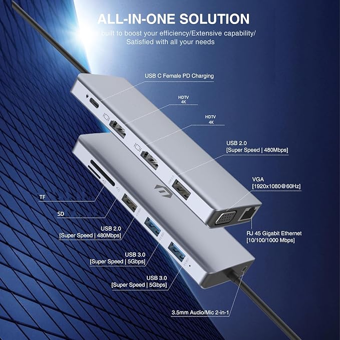 - Concentrador USB C masivo: el concentrador USB C Pro 13 en 1 de TOTU incluye puerto Ethernet/RJ-45, puerto de carga PD3.0 tipo C, 2 puertos USB 3.0, 2 puertos USB 2.0, 2 salidas de video HDMI con resolución 4K, VGA y lector de tarjetas SD y TF. Puerto de micrófono/audio en diseño extremadamente compacto y elegante.