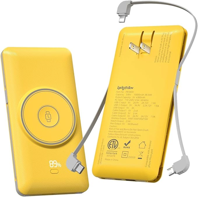 - Build in Cable and Wall Plug:Recharge the portable charger in two ways, built-in AC wall plug for a full charge in 3-4 hours, or use the Type-C (PD20W) port in 2.5-3 hours. At the same time, it comes with 3 different charging cables. You can charge different models of iOS or Android devices simultaneously. No matter where you go, you no longer need different generations of plugs and charging cables!