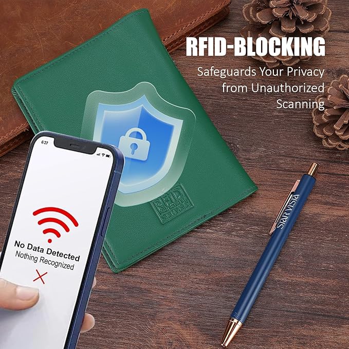 STAR VISTA Phoenix Leather Passport Holder, Calfskin Leather Travel Wallet - RFID Blocking, ID Window, Zipper Pocket, Pen & Notebook Included, AirTag Holder, Mint