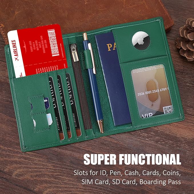 - VERSATILE STORAGE -- Interior slots for passport, boarding pass, folded cash, 3 cards, 1 ID window, 2 SIM slots, plus an AirTag holder