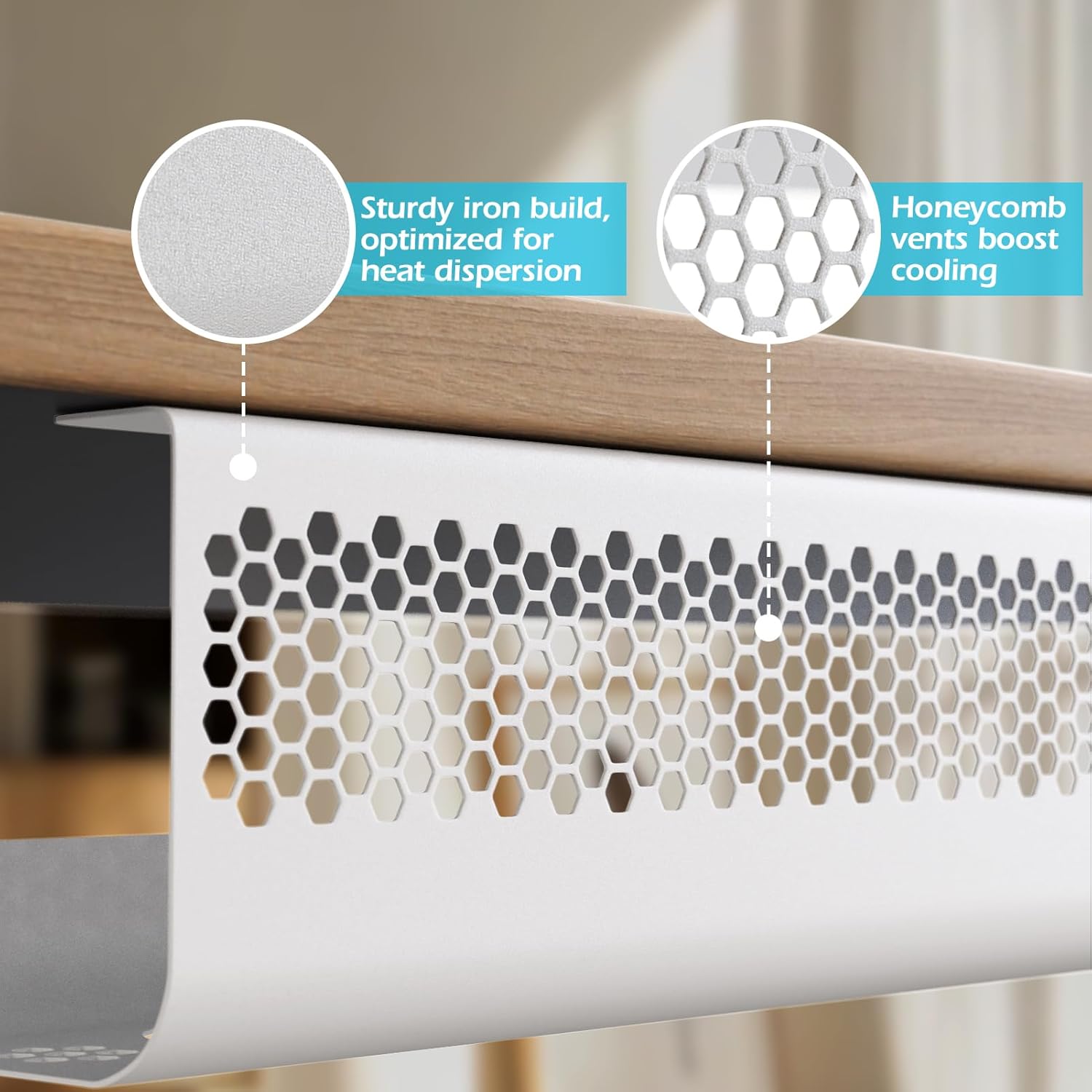 - Advanced Ventilated Hexagon Design - The ventilated hexagonal design keeps cables separated and cool, unlike flat cable trays, your under desk cable management prevents overheating by allowing proper airflow around power strips and chargers. The honeycomb structure neatly separates cords (USB, HDMI, power cables) to reduce tangling.