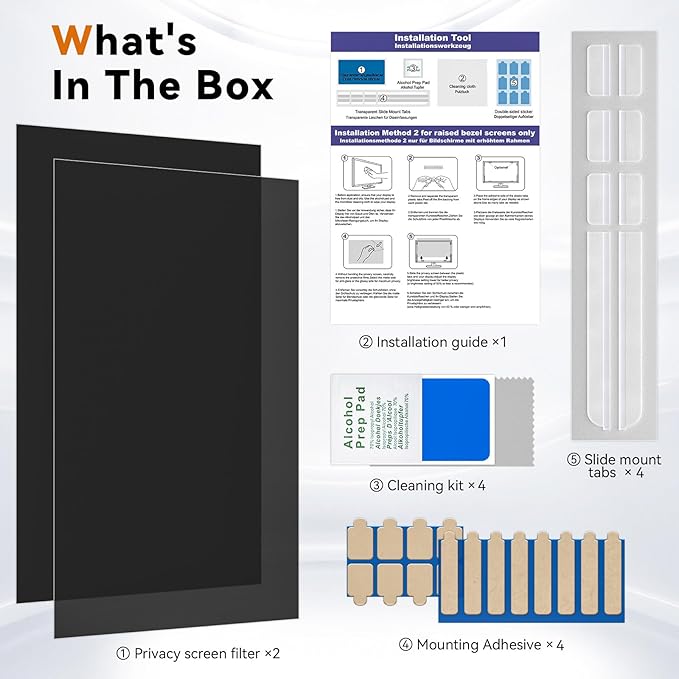 - 【TWO INSTALLATION OPTIONS】 1) Securely attach the included clear adhesive stickers directly onto your monitor's privacy screen filter for permanent placement; 2) Easily mount the plastic slide tabs along your screen's outer frame (for raised-bezel monitors only) to enable convenient sliding installation and removal. The complete accessory kit with detailed instructions is packaged for immediate use.