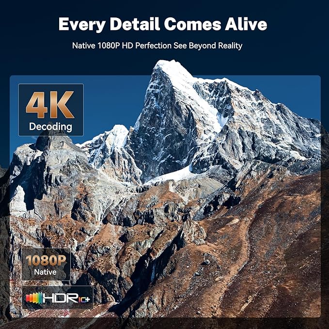 - [Native 1080P & Smooth 4K decoding] This 4k projector features 1500 ANSI lumens, a cinema-grade LCD optical engine, HDR10+ dynamic optimization, and a color gamut coverage of up to 98%. Experience the sharp details and true colors of native 1080P full HD resolution, while seamlessly decoding and playing 4K ultra-high-definition content, enjoying a smooth, fluid, and immersive large-screen visual experience, and effortlessly creating your own private cinema at home.