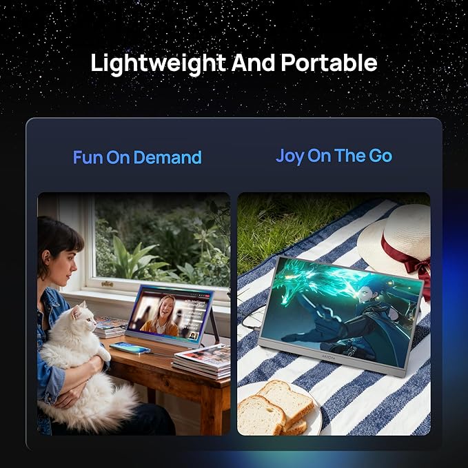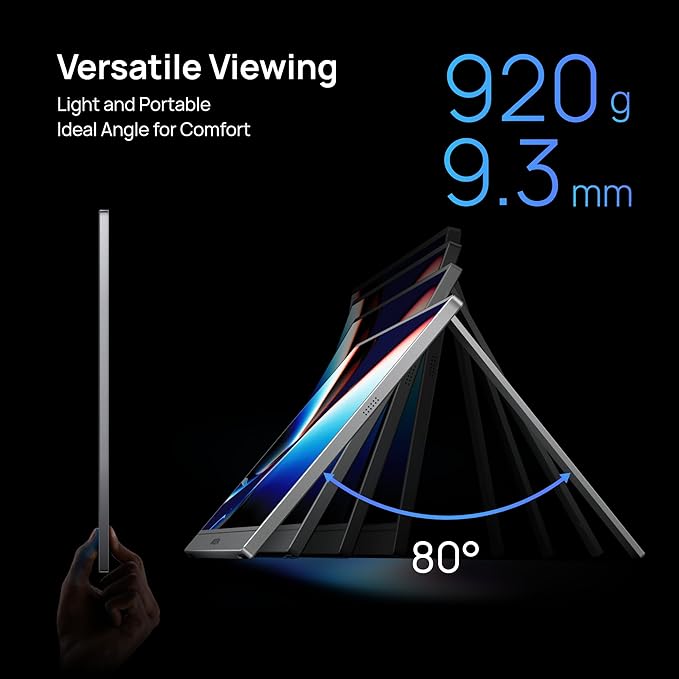 - [Designed for On-the-go Convenience] Just 2.16lb in weight, with a 0.36 inches slim profile and a narrow bezel that maximizes screen space. The integrated stand eliminates the need to carry an extra case to support the monitor, simplifying your portable setup. Ideal to be packed with laptop, convenient for on-the-go use