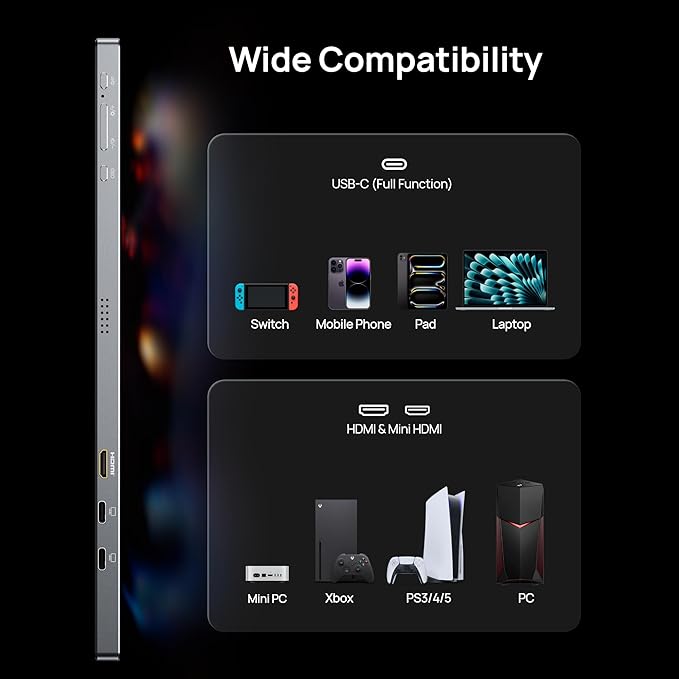 - [Seamless Compatibility] With USB-C and mini HDMI ports, it connects seamlessly to laptops, gaming consoles, phones, and more. Offers multiple display modes: duplicate, extend, second screen. Supports plug-and-play connectivity. Ensuring stable data transmission