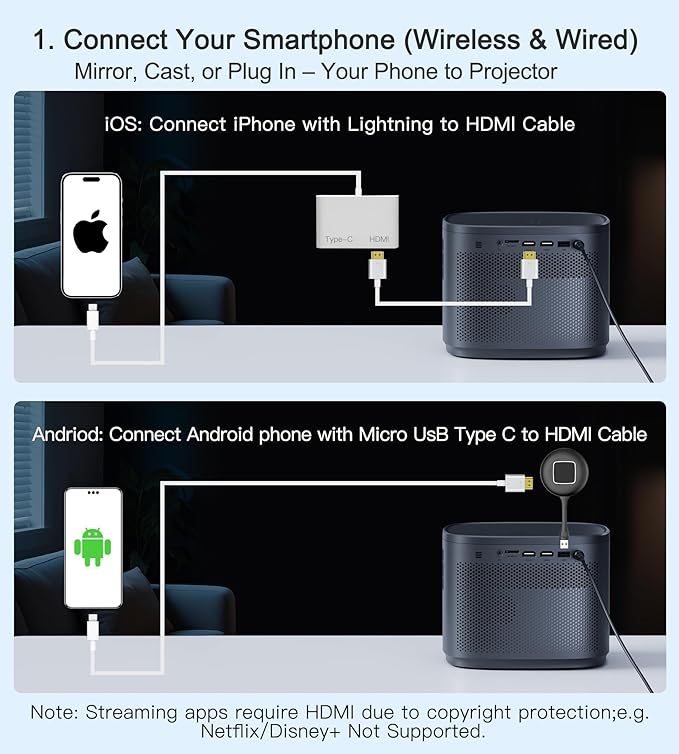 - 【3 Ways to Play: Netflix, Phones, Consoles & More】① Stream ANYTHING: Plug Fire Stick/Roku (not included) into dual HDMI 1.4 ports → Bypass HDCP to watch Netflix/Prime Video/Hulu without blackouts. ② Phone/Cast Screen: Connect iOS/Android via USB + MHL/Lightning adapter (not included) for mirroring. ③ Direct HDMI Play: Hook up laptops, PS5/Xbox, or Blu-ray players instantly. ((NOTE: No WiFi/Bluetooth. HDCP requires TV Stick for streaming apps)